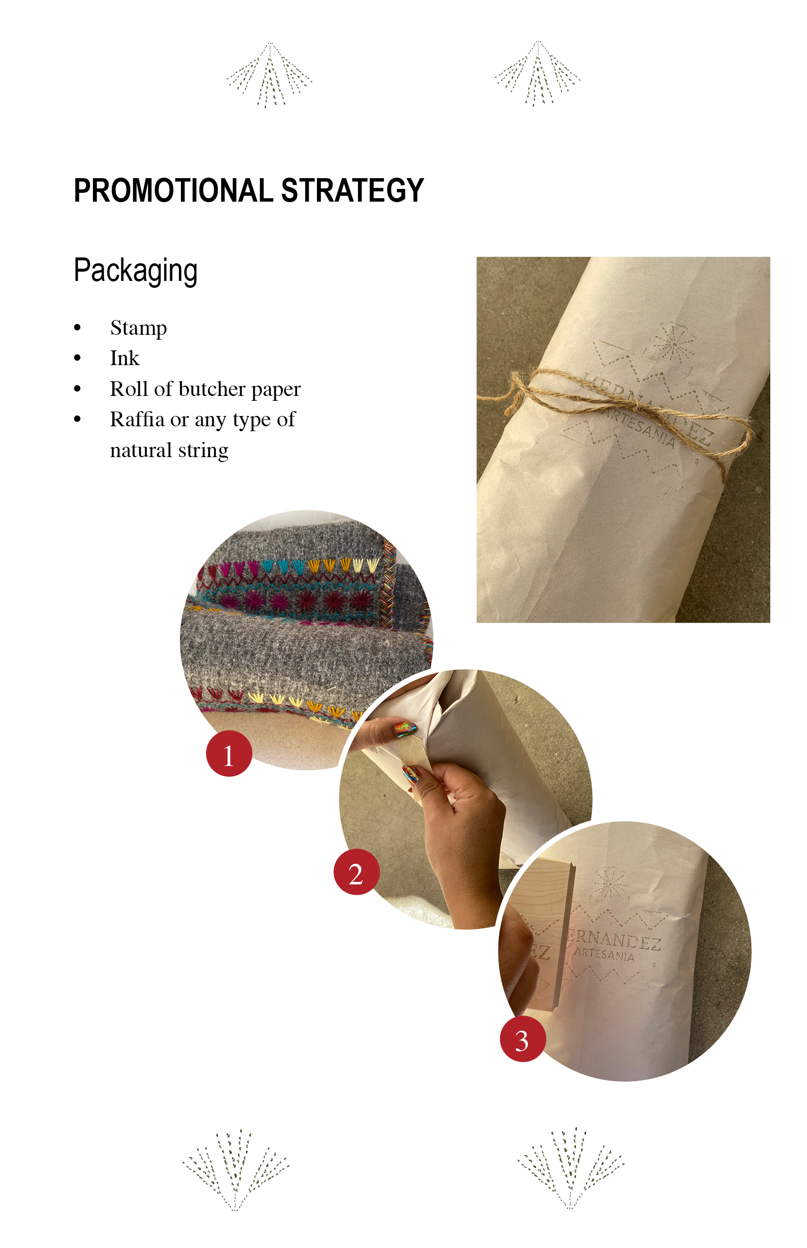 The promotional strategy consists of rolling out a simple brand identity using the newly designed logo for Hernandez Artesania. A rubber stamp application allows an easy and simple way of solidifying the Hernandez brand.It can be used for packaging a shipping order and/ or tagging articles for sale with a handwritten note about the garment.